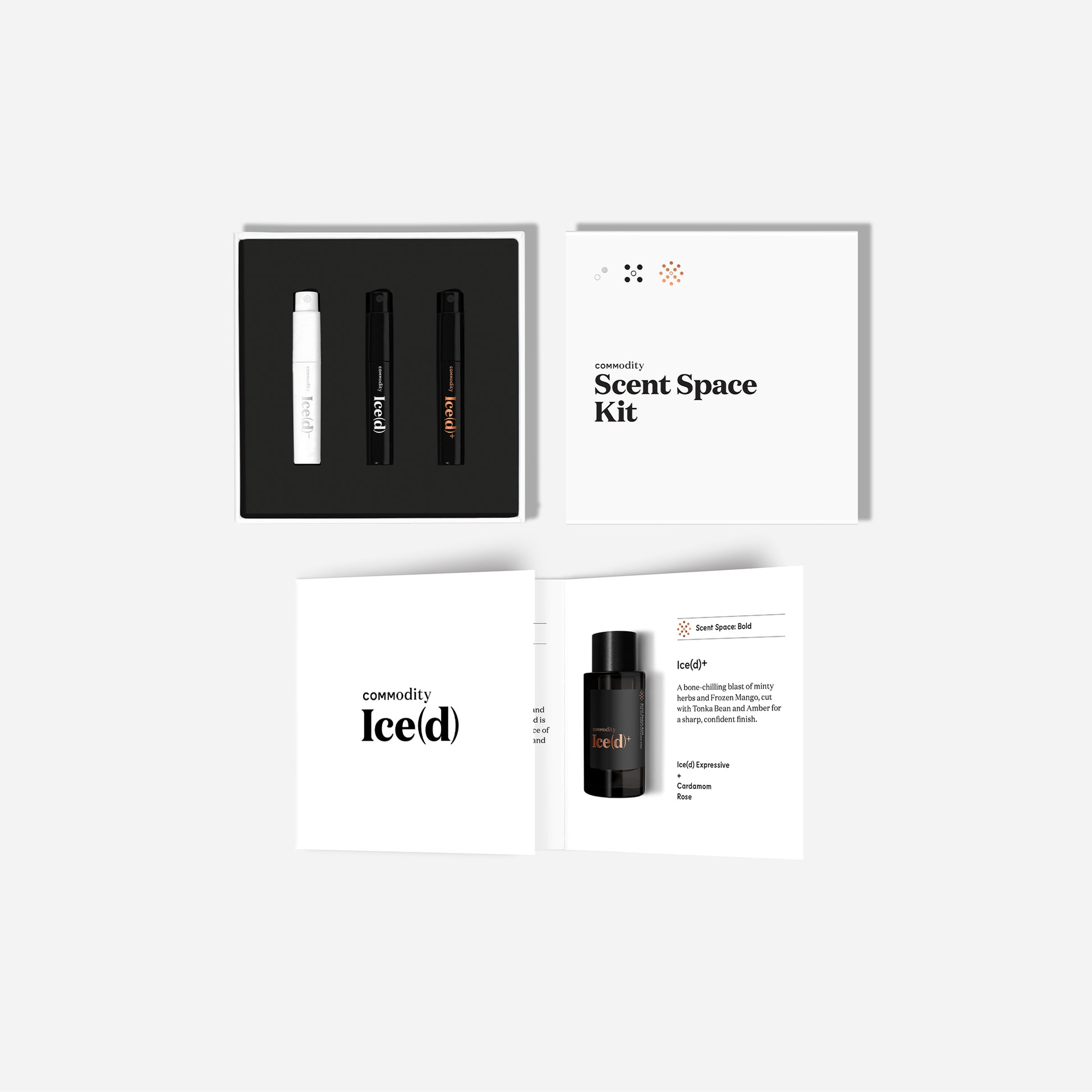 See kit sisaldab Ice(d) kõiki 3 Scent Space : tihedalt projitseeriv Personal, märgatavalt unikaalne Expressive ja ruumi täitev Bold versioon.